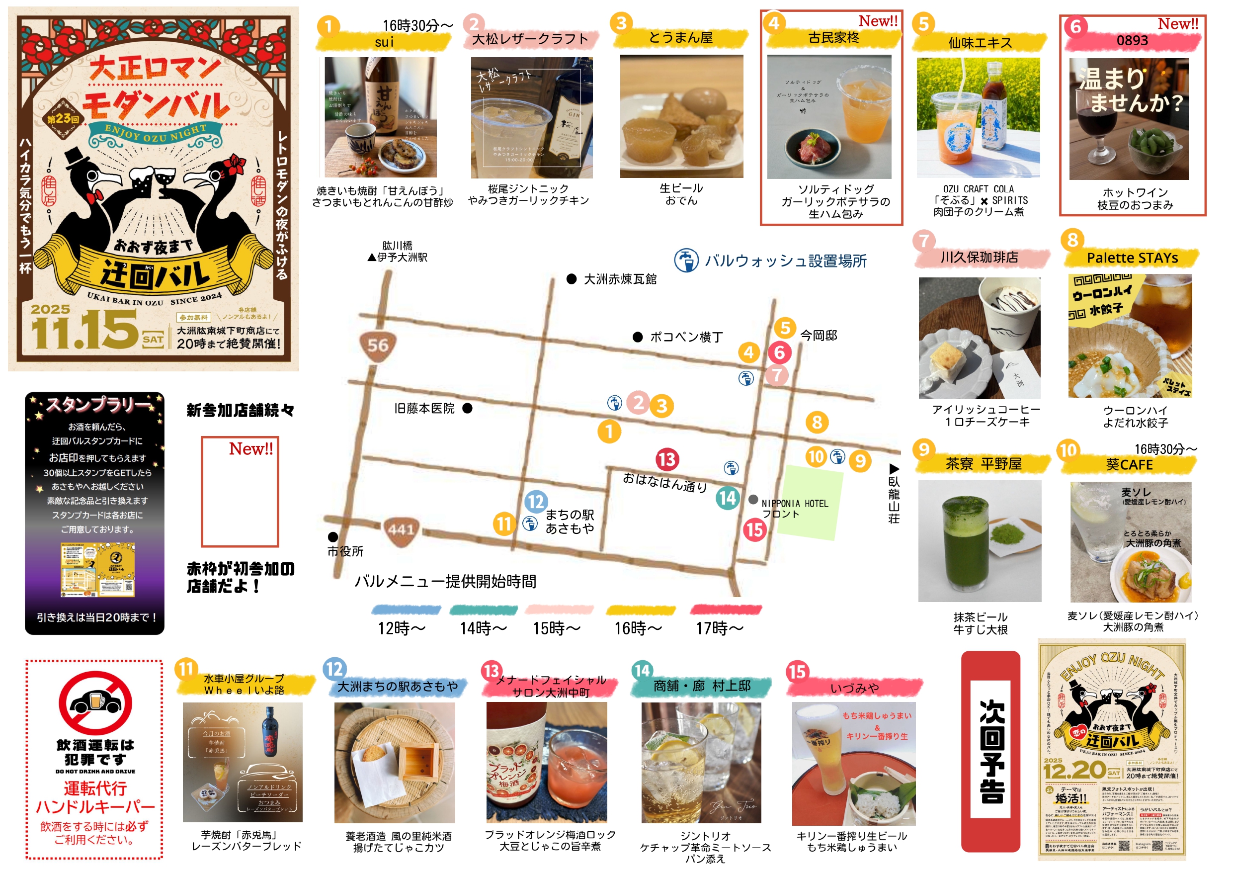 大洲市肱南地区では毎月、「おおず夜まで迂回バル」が開催されています。