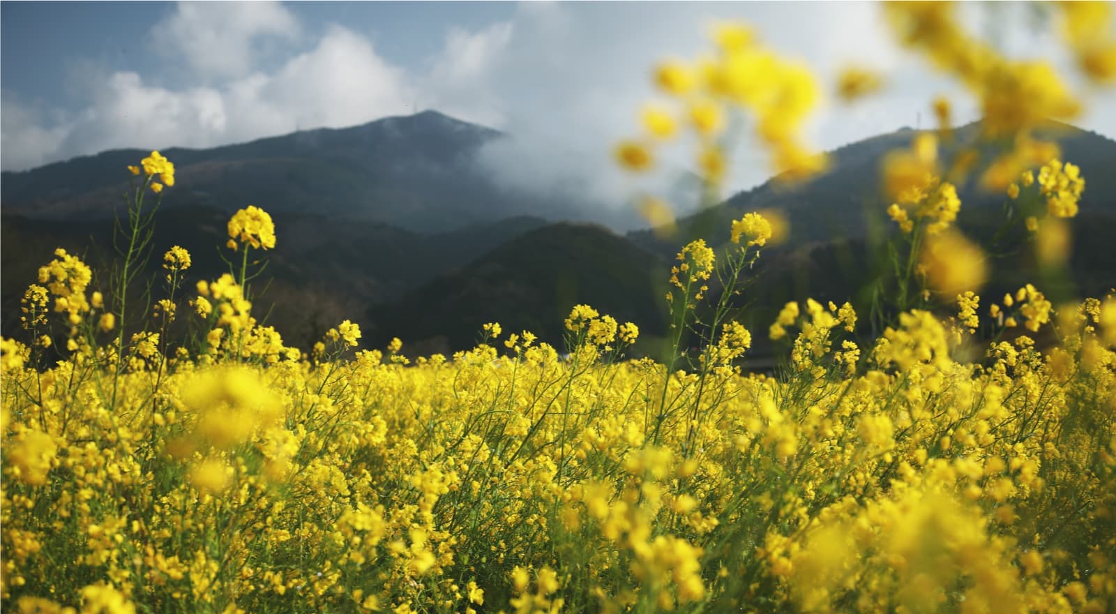 自然が生み出す美しき黄色やピンクの色彩に心が躍るのは何故だろうか。時に荒ぶる肱川に春をもたらすのは、一面に広がるまばゆいほどの菜の花たち。大洲盆地を一望する冨士山に連なって咲き誇るのは、春から初夏へ季節の移ろいを告げるツツジ。この地に暮らす人々が慈しむ花々に魅せられて、思い思いに散策にふける春の旅。