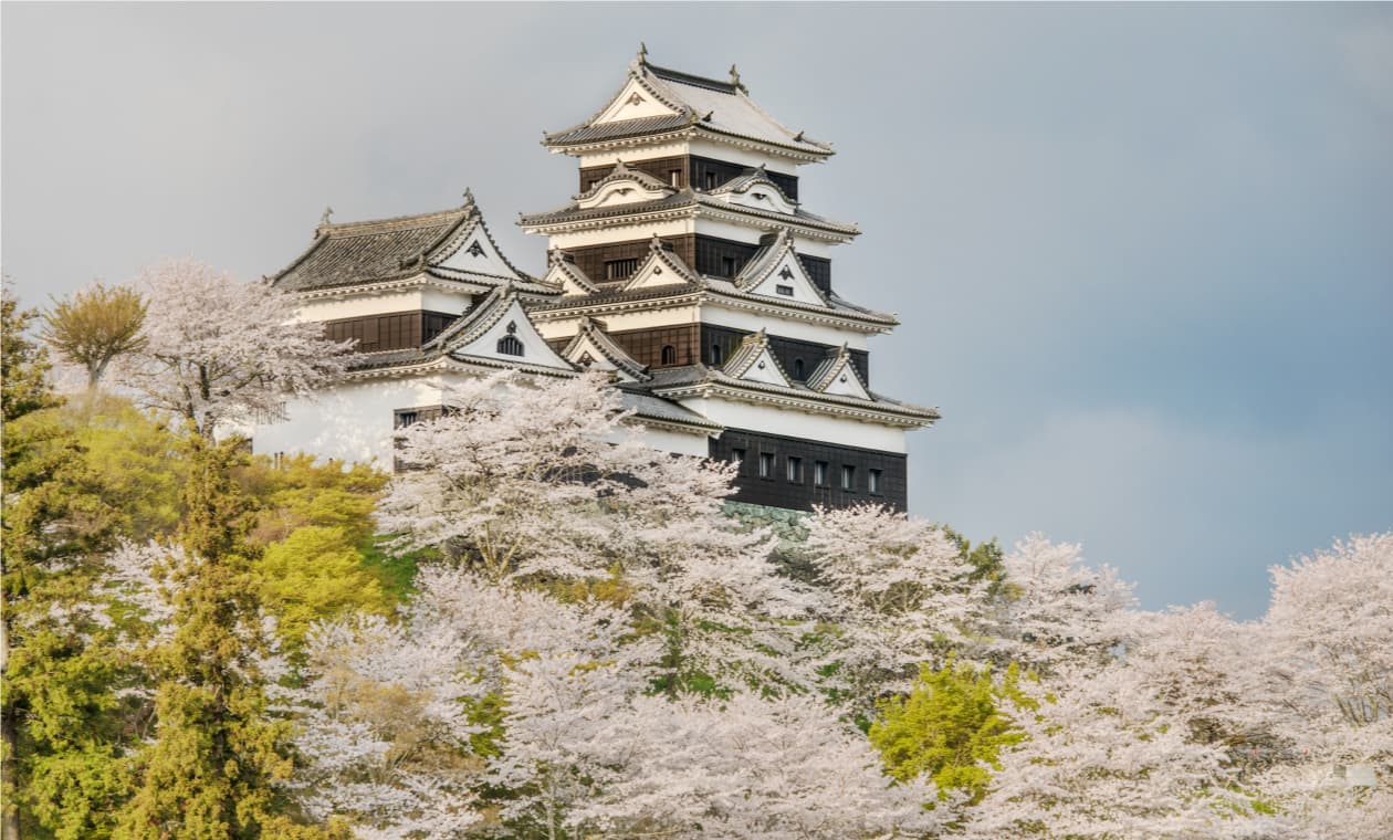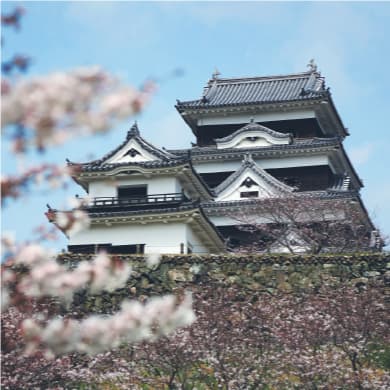 畔に佇む見事な城郭建築は、木造復元された天守をはじめ、国指定文化財に選定された4つの櫓がある。桜の名所としても知られ、本丸には200本ほどのソメイヨシノが咲き誇る。