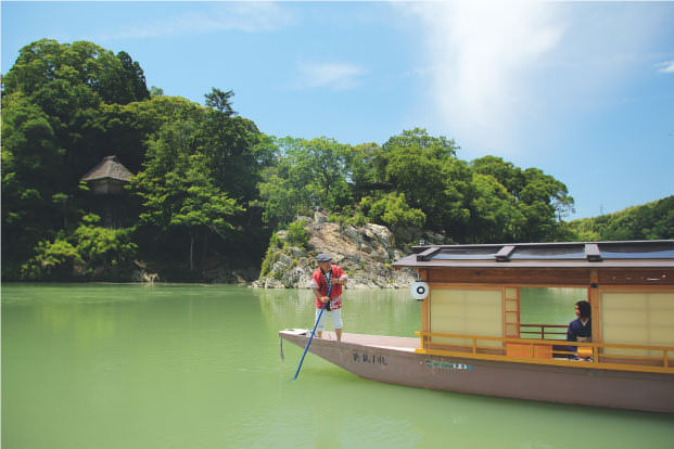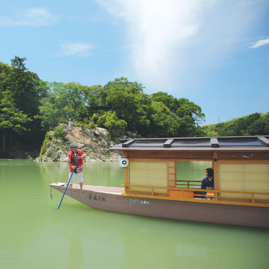 心地良い春風を肌に感じながら清流肱川を屋形船で下る「臥龍遊覧」。20分ほどの遊覧では、臥龍淵と不老庵の美しい景色と、木造天守を湛える大洲城をめぐる。