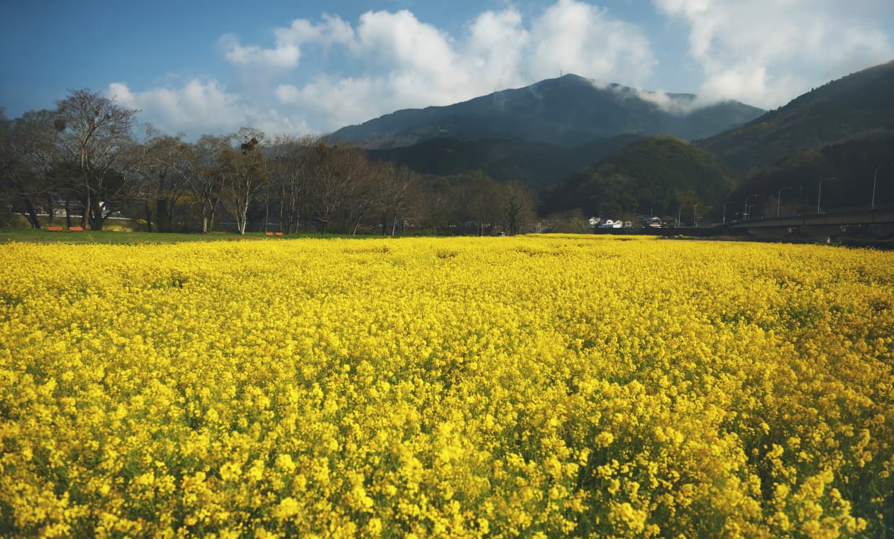 五郎河川敷と呼ばれる肱川左岸には、350万本もの菜の花が咲く広大な花畑がある。3月上旬から見頃を迎え、見渡す限りの菜の花は、さながら黄色にかがやく絨毯のよう。そこから僅かに下った先にある通称“五郎の赤橋”の傍らにも、菜の花畑が広がる。二つの菜の花畑は、大洲の春を象徴する風物詩のひとつだ。