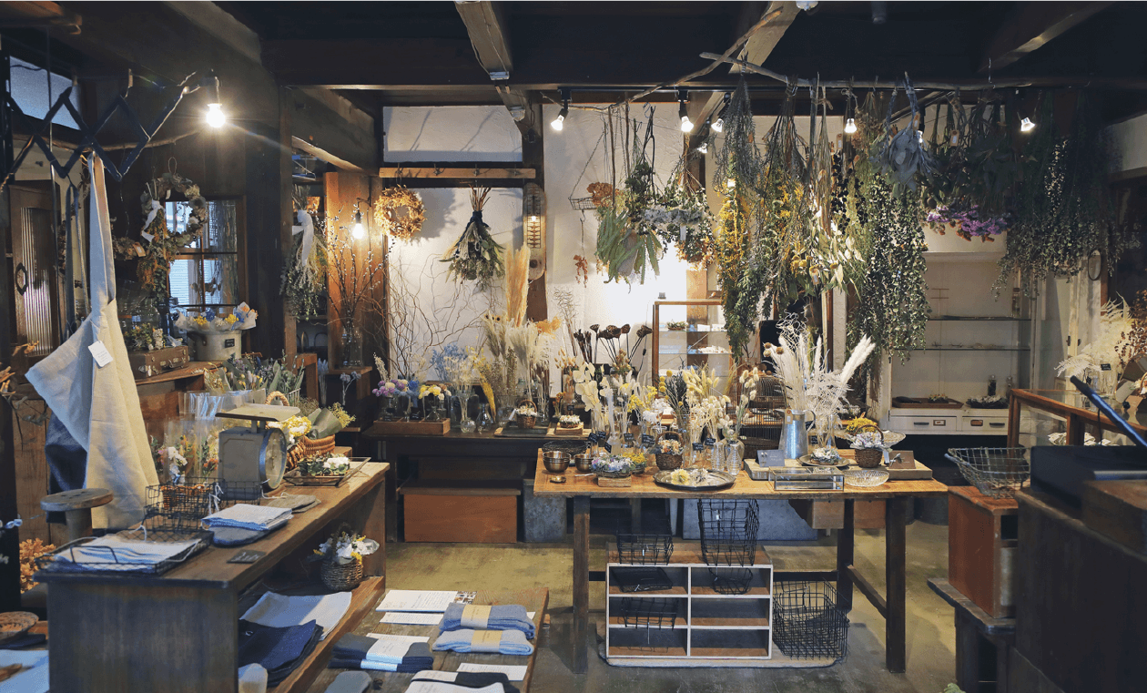 店には、ドライフラワーの数々と雑貨・焼菓子などが並び、やさしい時間が流れる。ここは、心を豊かにするモノたちに囲まれた幸せな場所。
