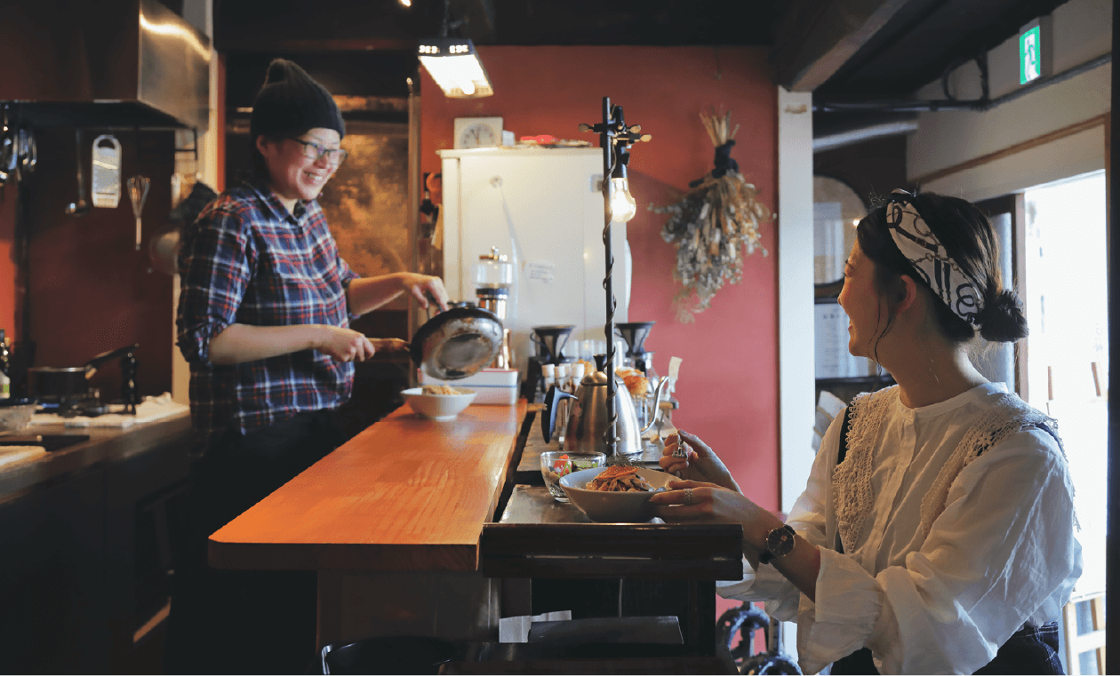ゲストハウス内のカフェ&バーでは、地産の食材を使ったランチやスイーツが味わえる。地元愛に溢れた店主は、“大洲のうかい”の船頭でもあり、気さくな彼らとの距離感に、心地良く時が過ぎる。まち歩きに疲れたら、しばし足を止め「はだごや 霧中」で大洲談義に花を咲かせるのも一興。