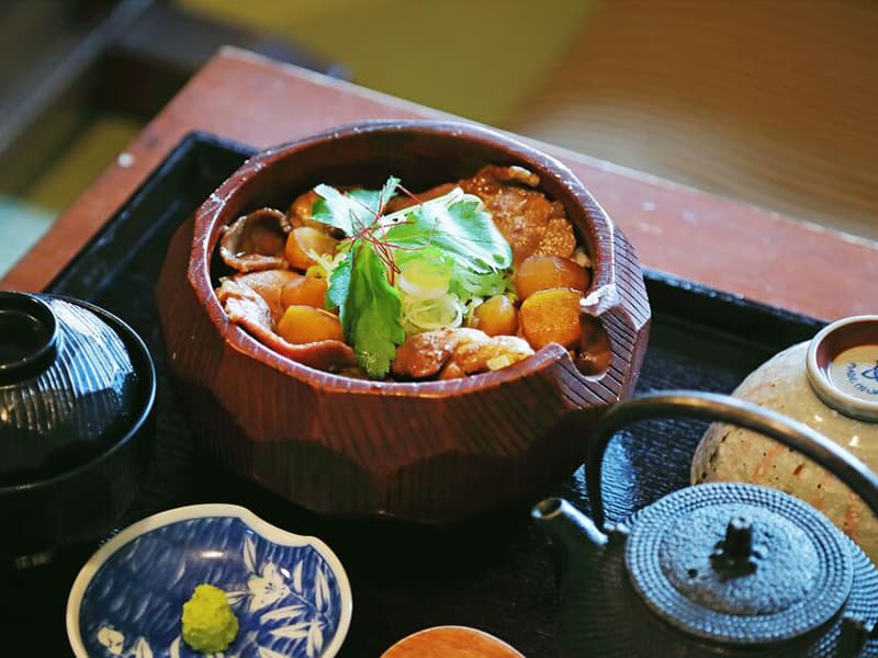 大洲名物、とんくりまぶし。豚肉と四国一の生産量を誇る大洲の栗を、おひつにたっぷり盛り込み、わさび・三つ葉・ネギ・白胡麻・きざみのり・糸唐辛子などの薬味をトッピング。最初はそのまま、途中からはお出汁をかけてお茶漬けにしていただきます。しっかり味のお肉に栗の甘み、さらに薬味とお出汁の風味が加わって、また違った味わいに。
