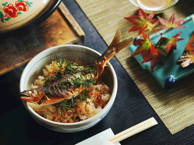清流肱川の恵みを享受した大洲の川魚。弾けるような橙色のお刺身、土鍋でふっくらと炊きあがった釜飯、魚の身を香ばしく焼き上げ、麦味噌をあわせてご飯とともにいただく、伝統料理さつま。こんがりと焼けた身に塩が香ばしく交わる塩焼きなど、愉しみ方は様々。
