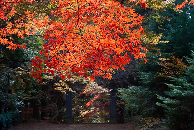 赤く燃ゆる紅葉のその色を、澄んだ水面に映す。